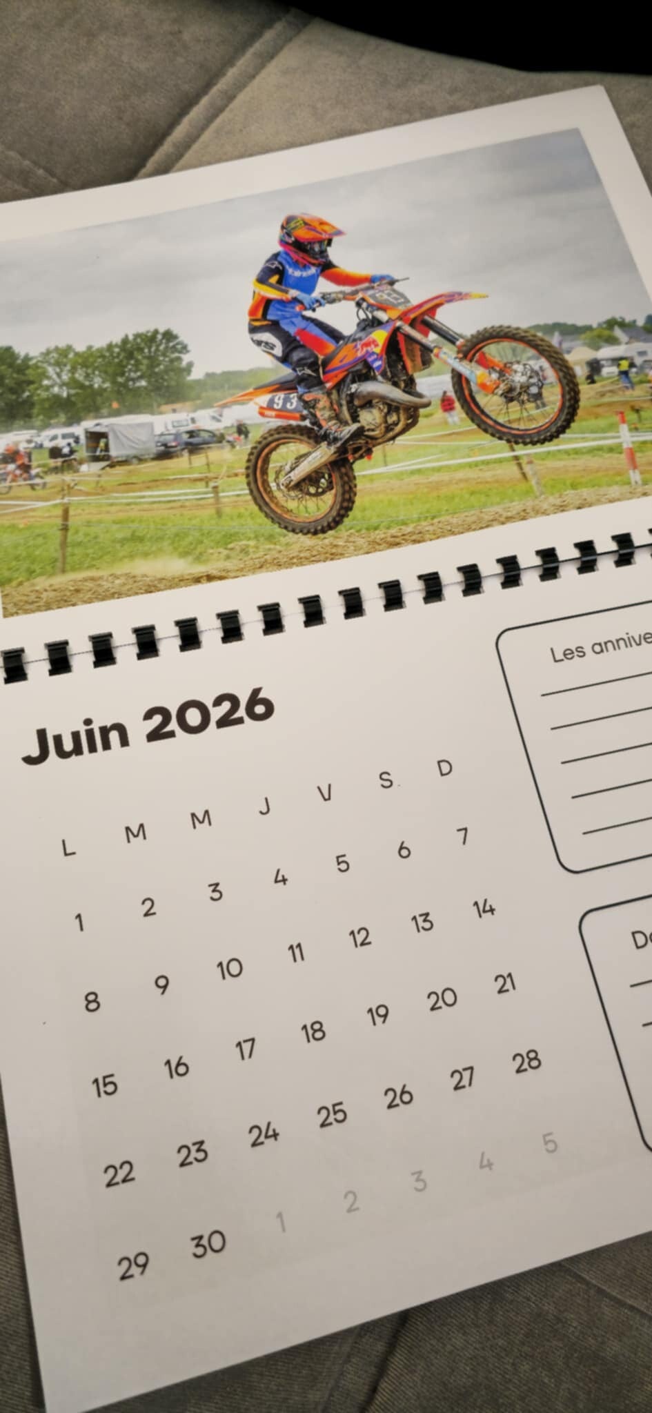 Découvrez nos calendriers personnalisés, conçus avec amour par Laeti et Pics Photography. Chaque mois, revivez vos moments les plus précieux. Parfait pour les familles, les amis, et même les passionnés de motocross. Affichez votre fierté, offrez un sourire !